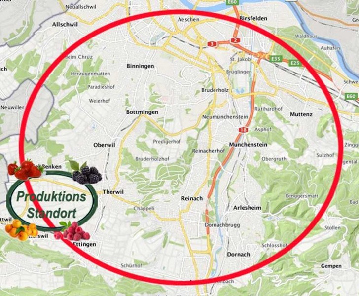 Wir pflanzen fast alle ( 90 % ) unsere Verkaufs- Früchte im Witterswilerfeld süd-westlich Therwil BL an. Unsere Aktivitäten von Anbau bis zur Vermarktung finden im 15 Km Kreis der eigenen Produktion statt. Alle unsere Früchte wachsen und gedeien in der Schweiz, und wir verkaufen fast nur eigene Ernte.